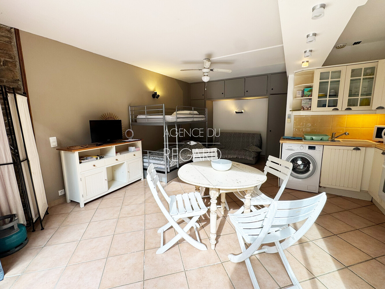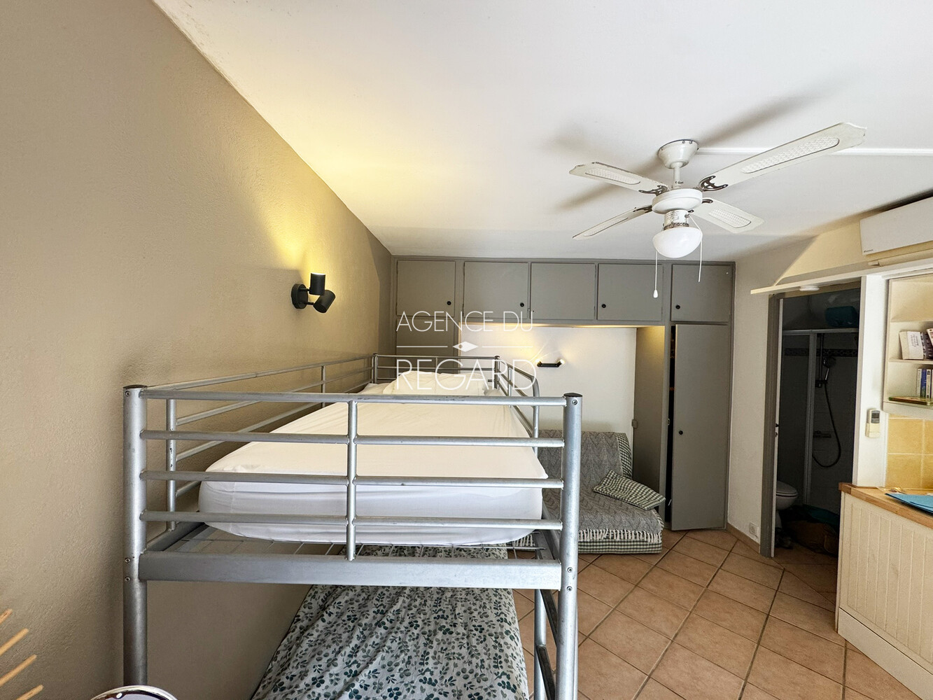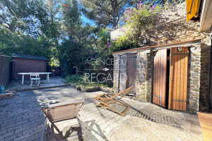 Bormes-les-Mimosas, in the private and guarded domain of Gaou Bénat, this property of about 62sqm, facing south, enjoys an exceptional location 3 minutes by walk from Gaou Bénat beach. House of 28sqm, modern in style, with equipped kitchen opening onto a living room extended to the south by a terrace. Garden shelter. DPE in progress.