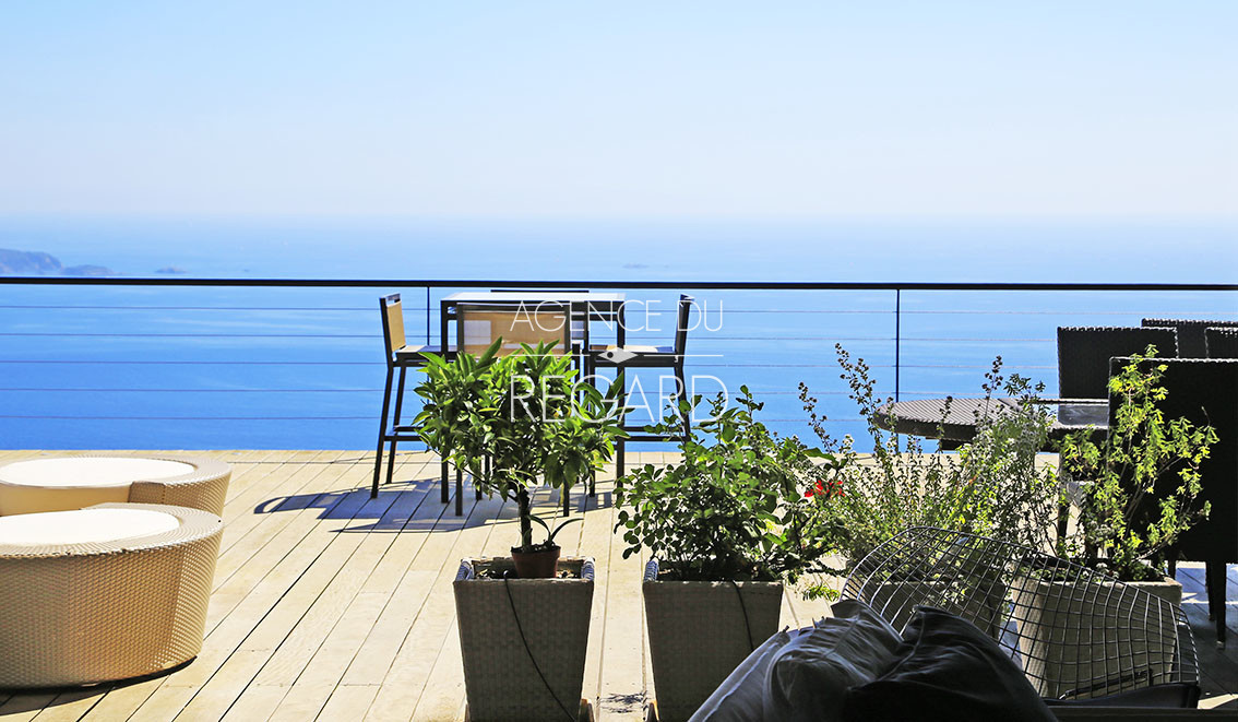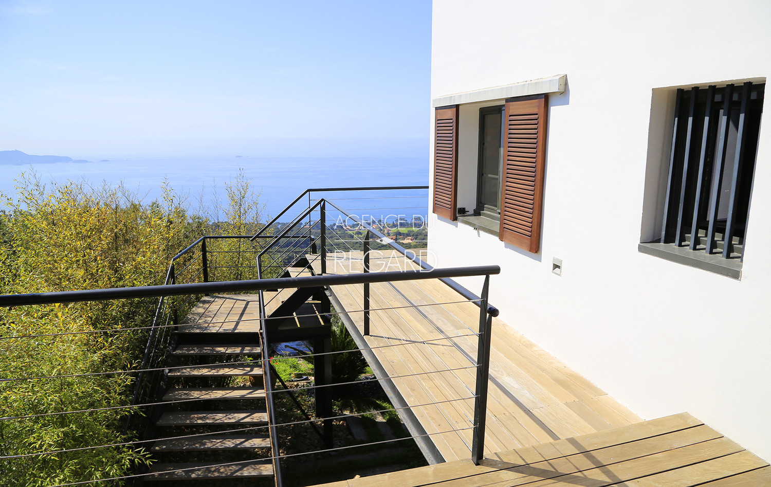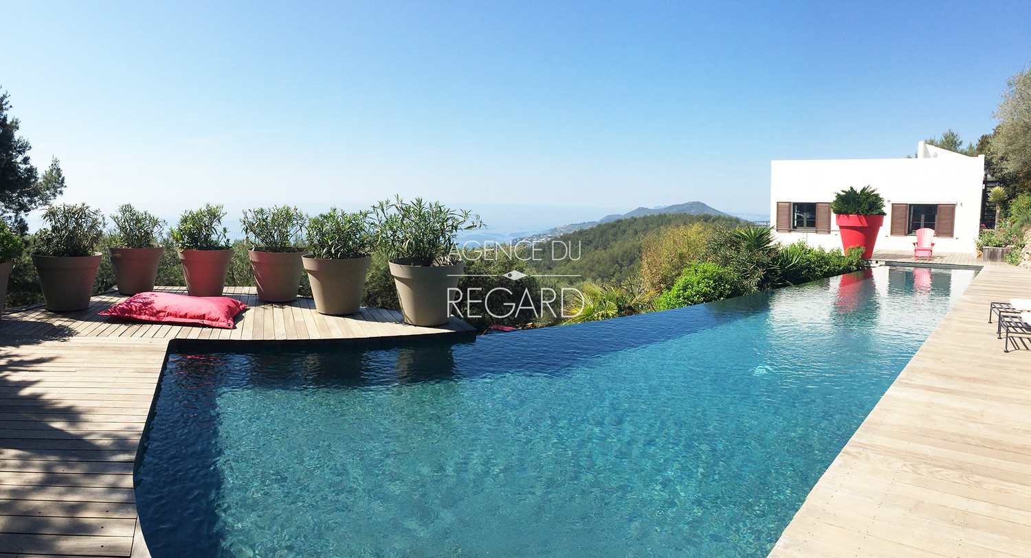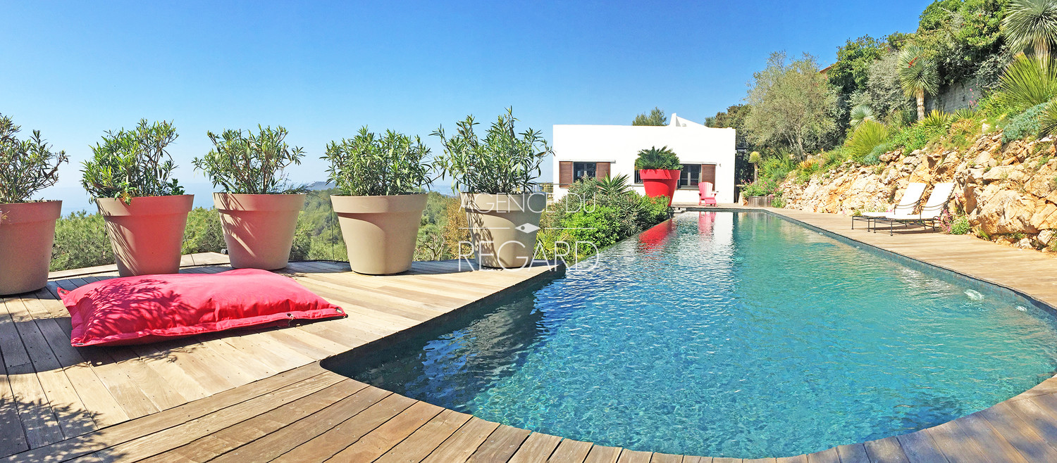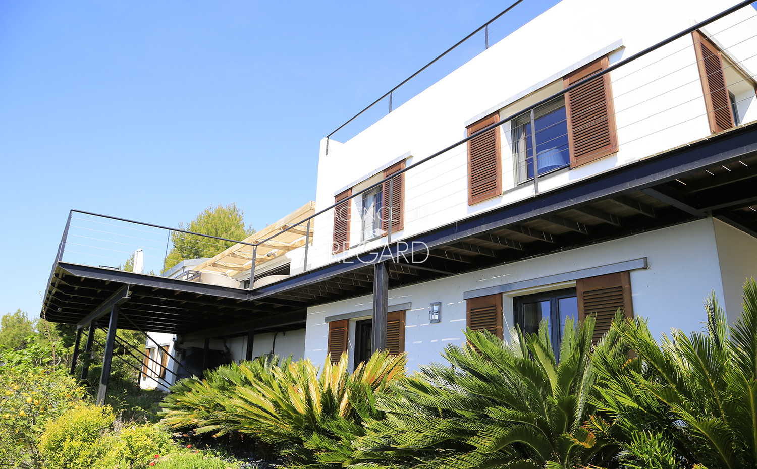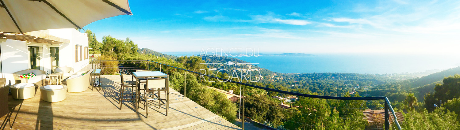 At Carqueiranne, in a private domain, an elegant and warm architect's villa of about 280sqm renovated in 2008 with a panoramic and aerial view on the islands. The plot of about 1 752sqm hosts a beautiful exotic garden sheltered from the wind. The house facing south, with terraces (about 240sqm) and a spacious reception room (110sqm) offers 5 bedrooms including a master suite and a separate studio. All rooms open facing the spectacular sea view. Pool heated (17 meters) with water horizon. Car port. Solarium.