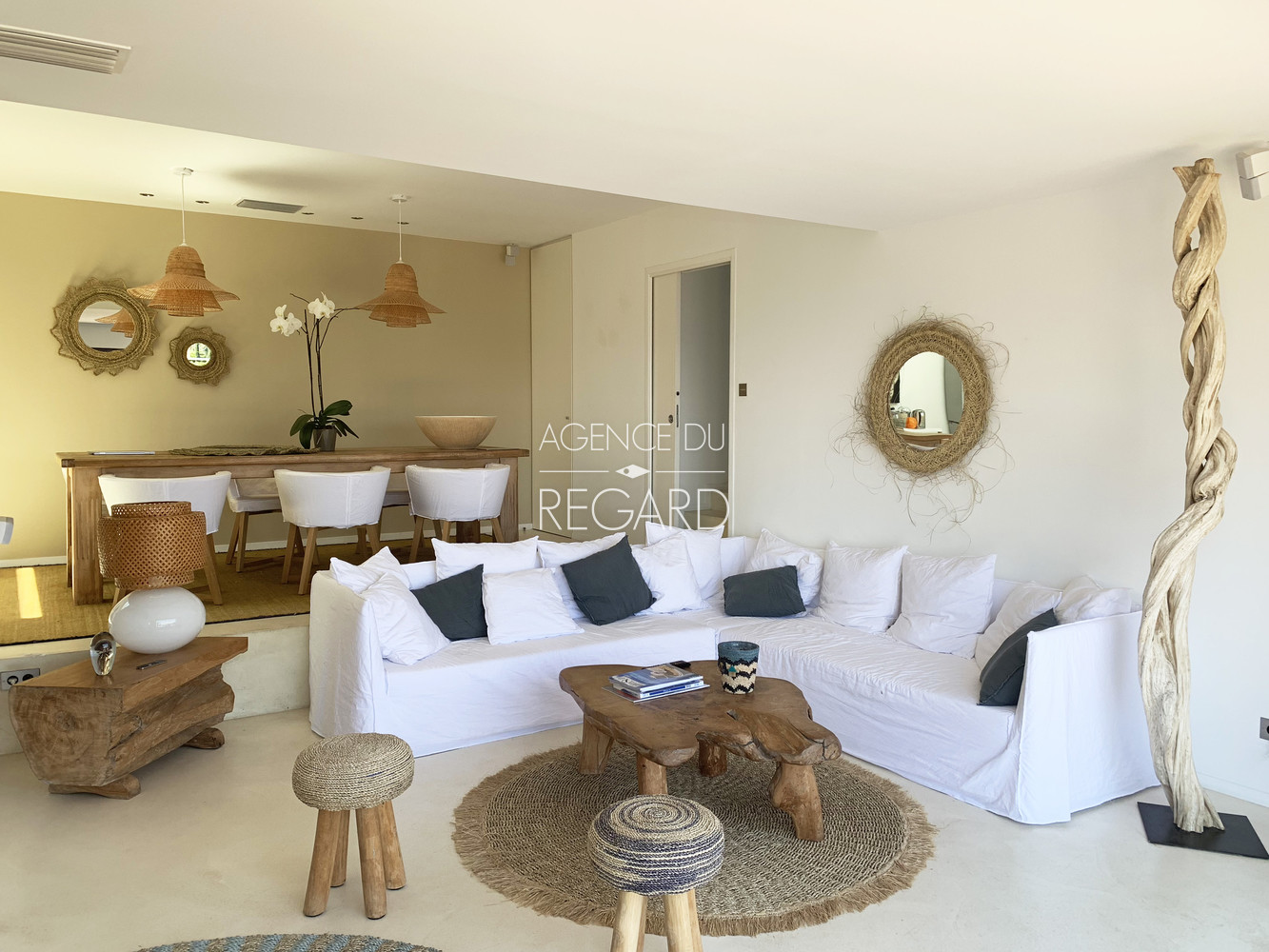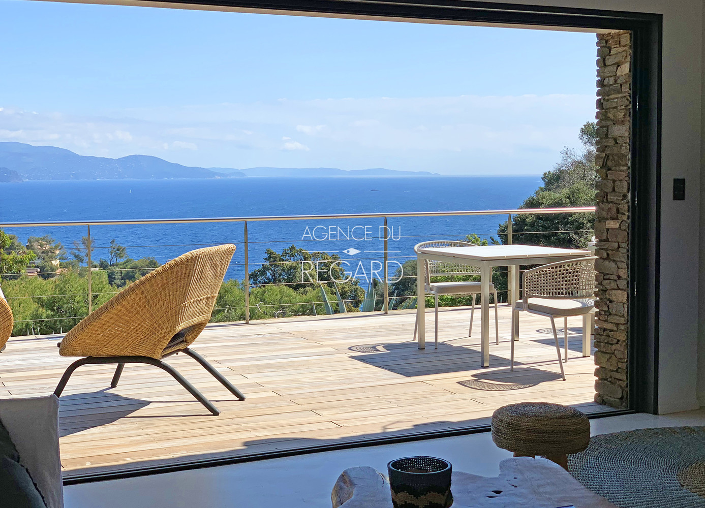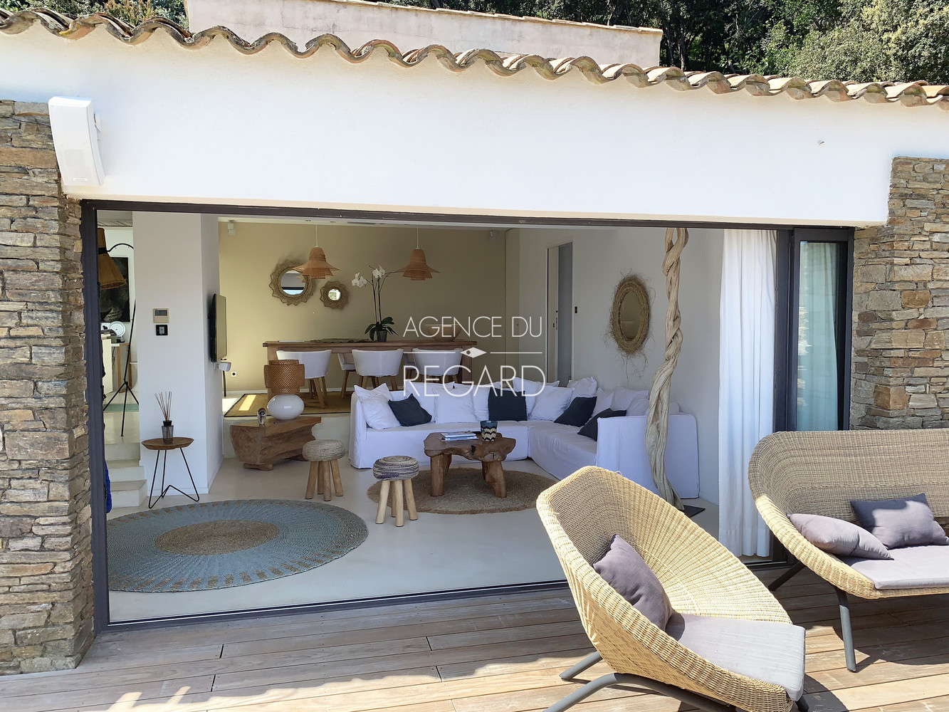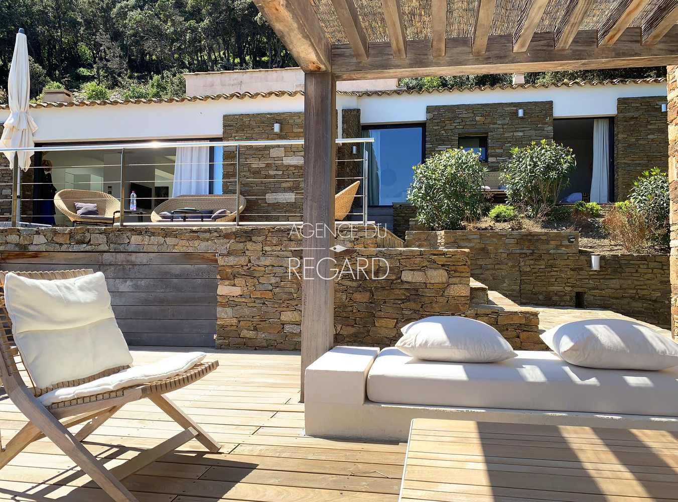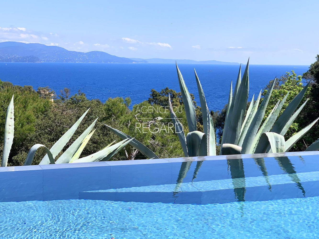 In Bormes-les-Mimosas, in the private and guarded domain of Cap Bénat, this property of about 2,040sqm is in absolute calm. The land is wooded and the garden perfectly maintained. A vast esplanade in dominant position, on which is located the house and the swimming pool, benefits from a very beautiful sea view. Contemporary house with sea view of about 178sqm built on one level with quality materials. It offers beautiful volumes and great brightness. 5 bedrooms with their bathroom. Swimming pool. Garage.
