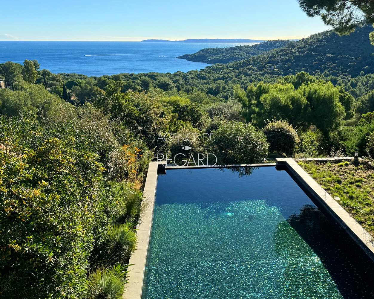 In Bormes-les-Mimosas, in the private and guarded domain of Gaou Bénat, this property of about 839sqm enjoys a beautiful view of the sea, the Ile du Levant and the open sea. Its garden is perfectly landscaped and its swimming pool area (5x10m) takes advantage of this beautiful panorama. Villa of about 194sqm completely renovated in 2022 with high quality materials and tastefully decorated. 5 bedrooms with their shower room and w.c. Air-conditioned wine cellar. Bowling alley. garage.