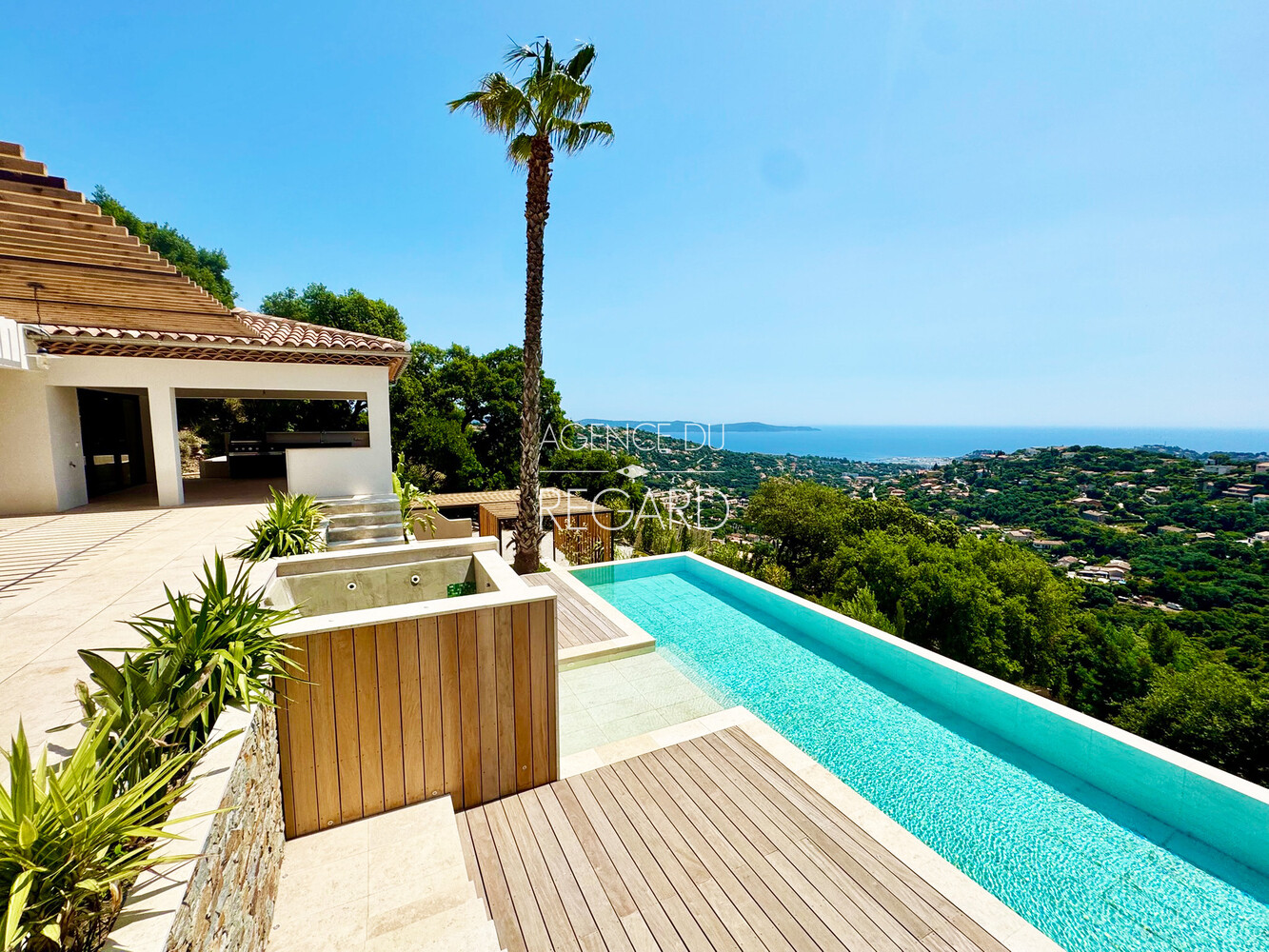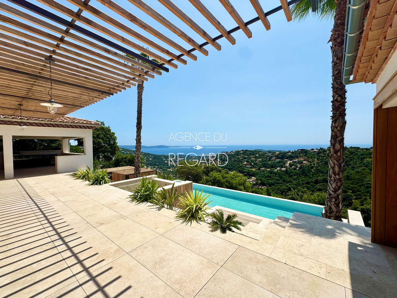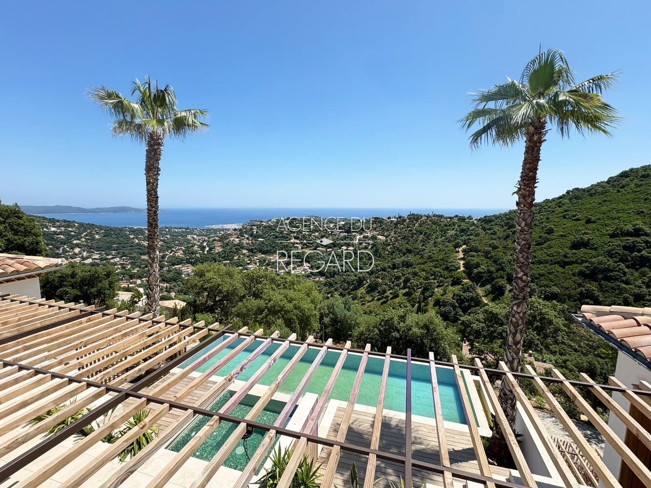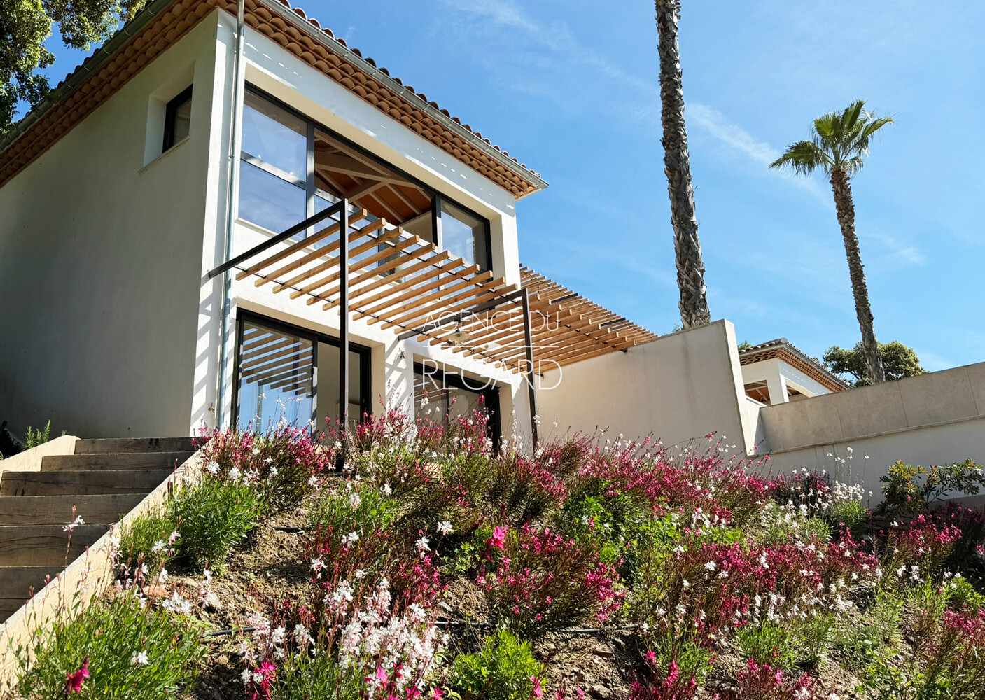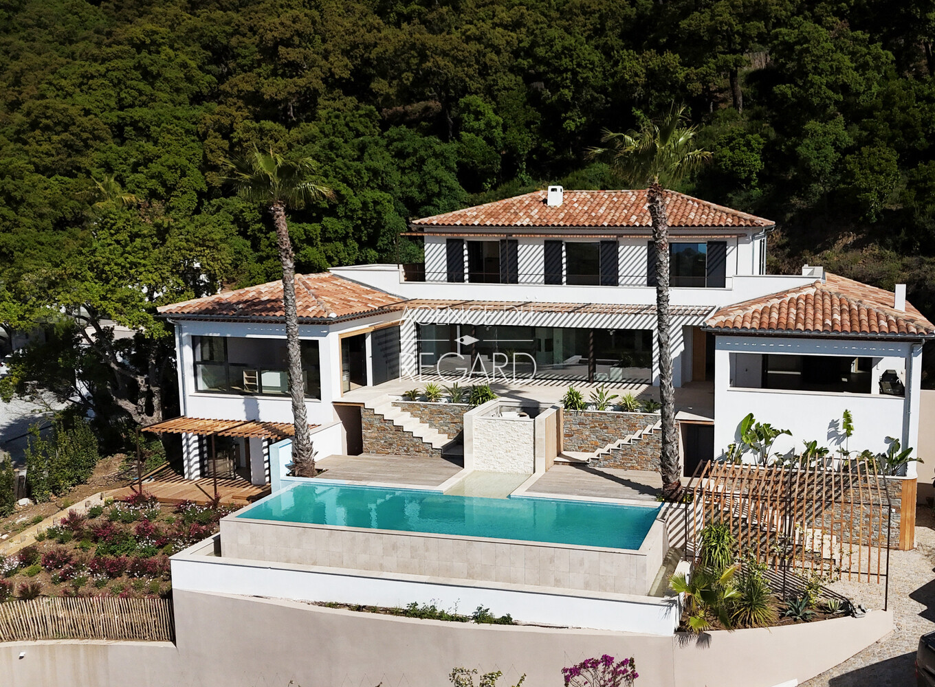 Just 8 minutes from a beautiful sandy beach with crystal-clear waters, this 3,576sqm south-facing property is located in a very quiet area on the hills of Cavalaire. It enjoys a beautiful sea view. The perfectly landscaped garden is planted with Mediterranean species. This traditional 270sqm villa, built on three levels, was completely renovated in 2025 with quality materials. The living areas extend onto terraces that enjoy this magnificent sea view. There are 5 en-suite bedrooms and a studio. Swimming pool with jacuzzi. Garage. Energy Performance Certificate: B – GES: A