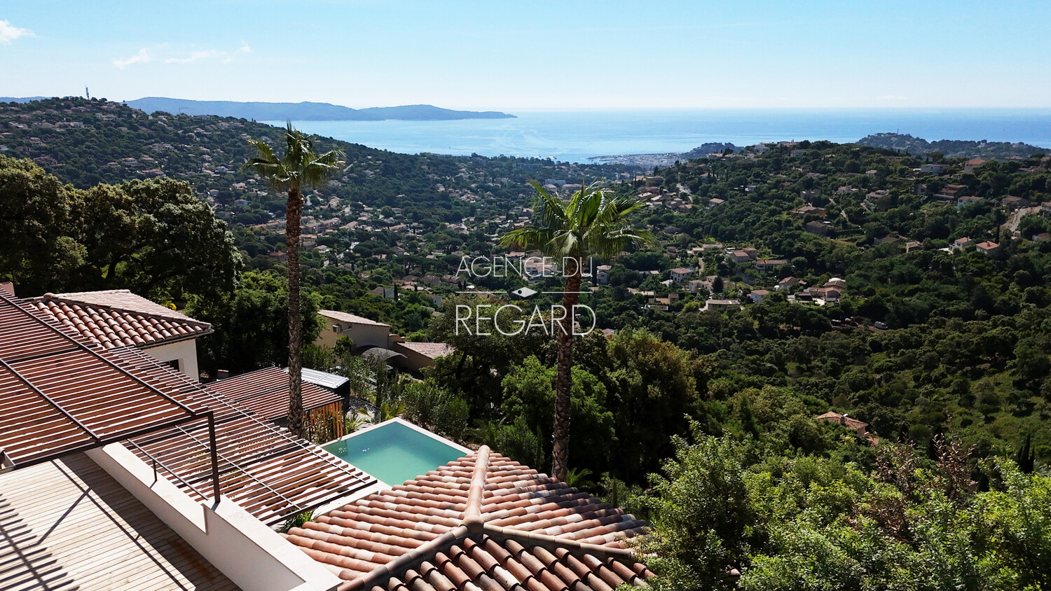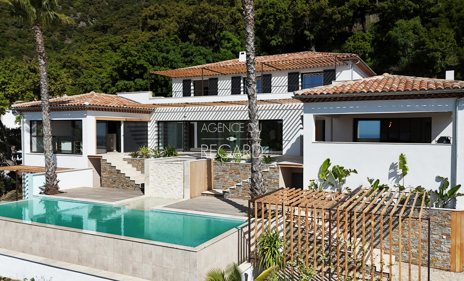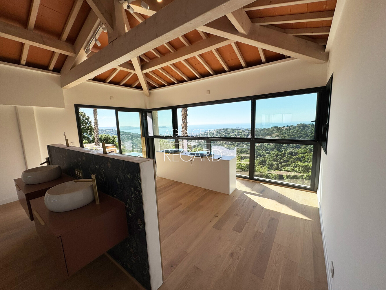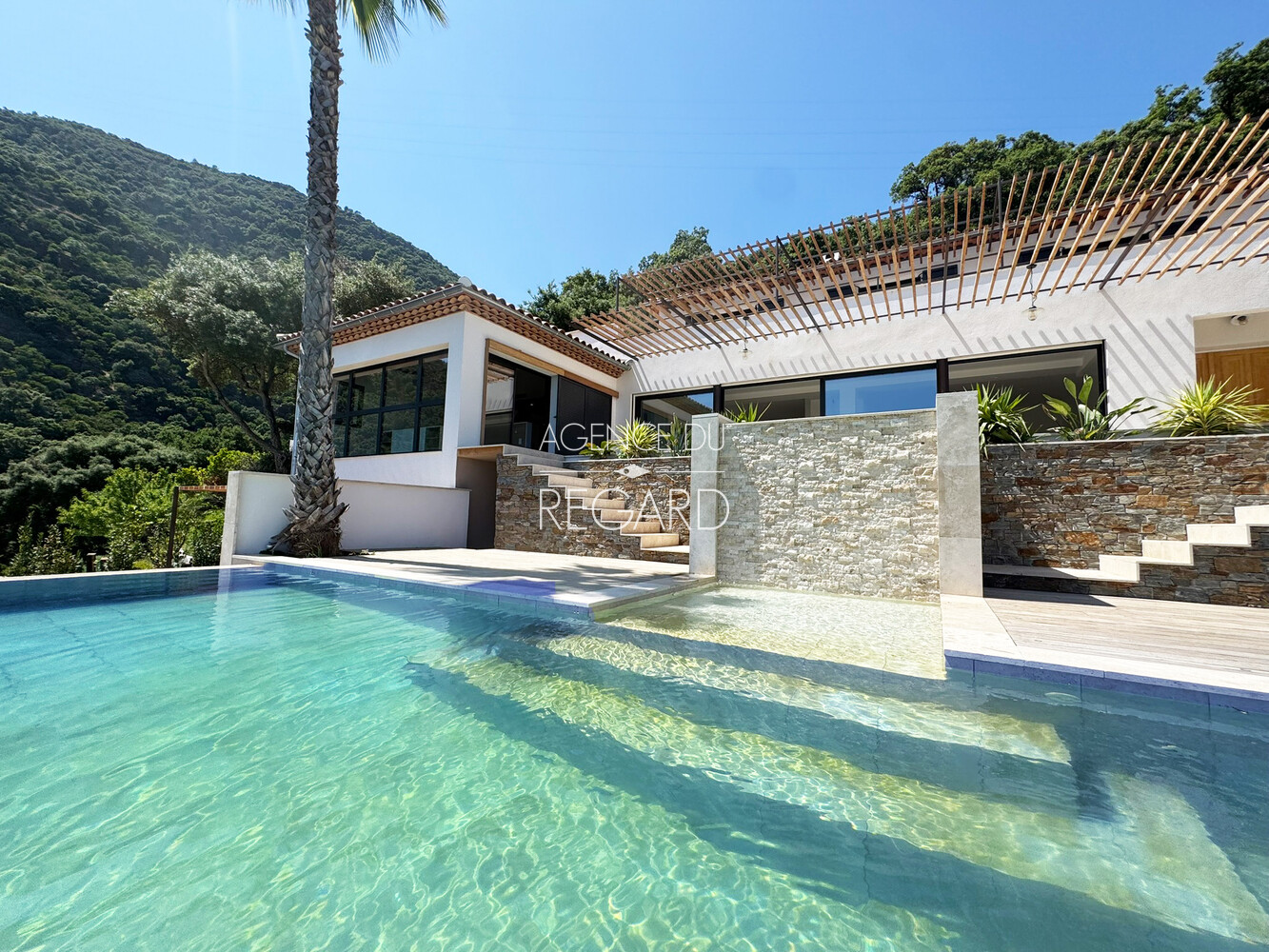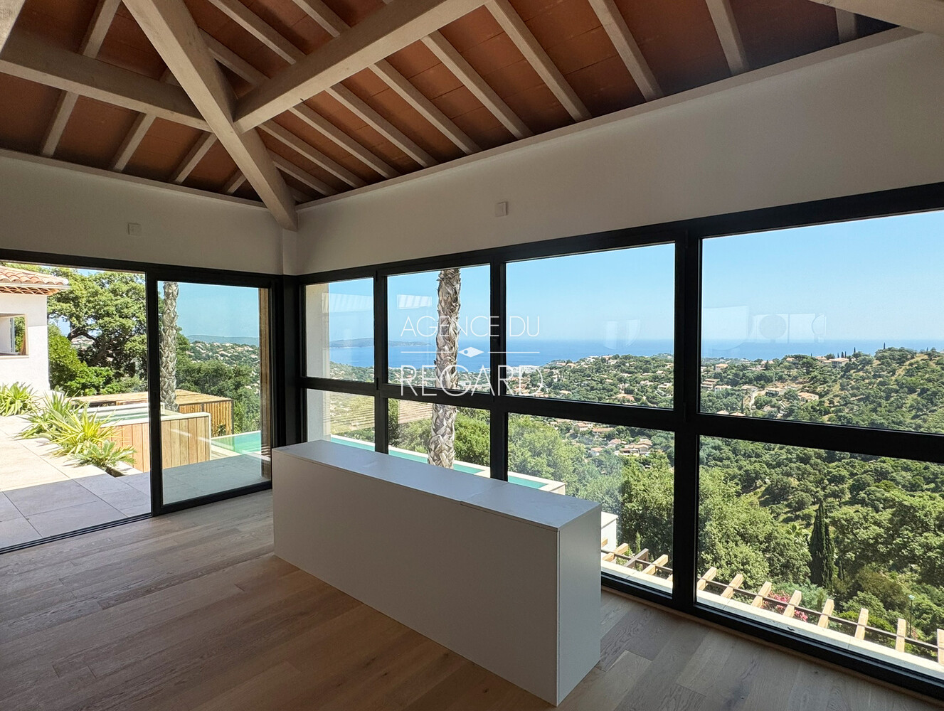 Just 8 minutes from a beautiful sandy beach with crystal-clear waters, this 3,576sqm south-facing property is located in a very quiet area on the hills of Cavalaire. It enjoys a beautiful sea view. The perfectly landscaped garden is planted with Mediterranean species. This traditional 270sqm villa, built on three levels, was completely renovated in 2025 with quality materials. The living areas extend onto terraces that enjoy this magnificent sea view. There are 5 en-suite bedrooms and a studio. Swimming pool with jacuzzi. Garage. Energy Performance Certificate: B – GES: A