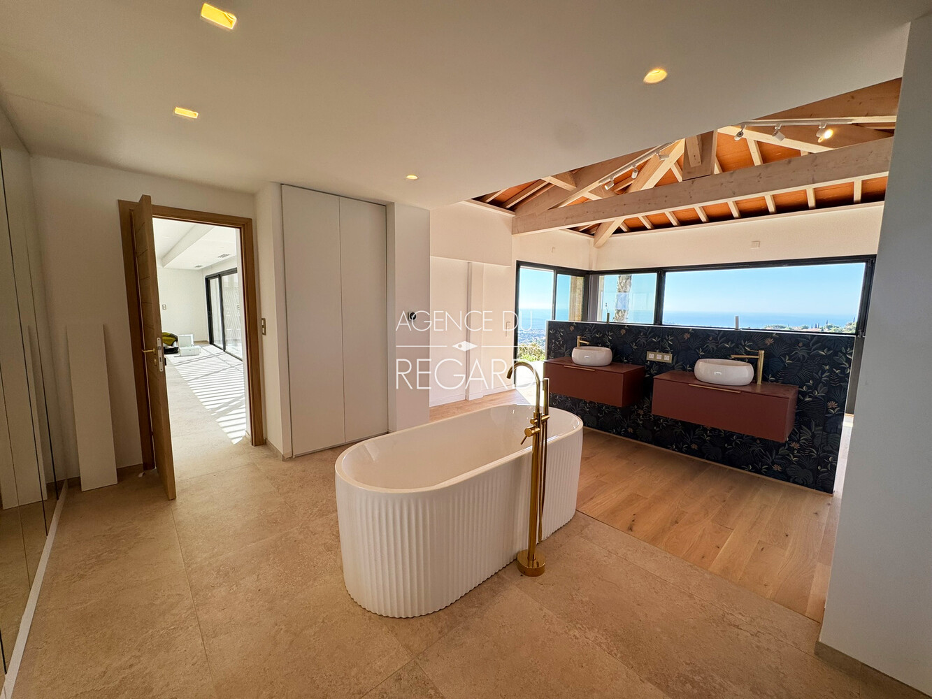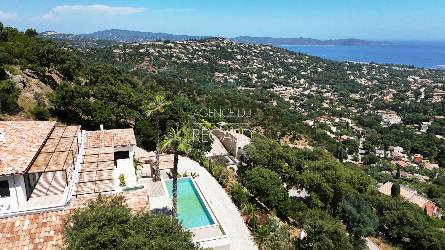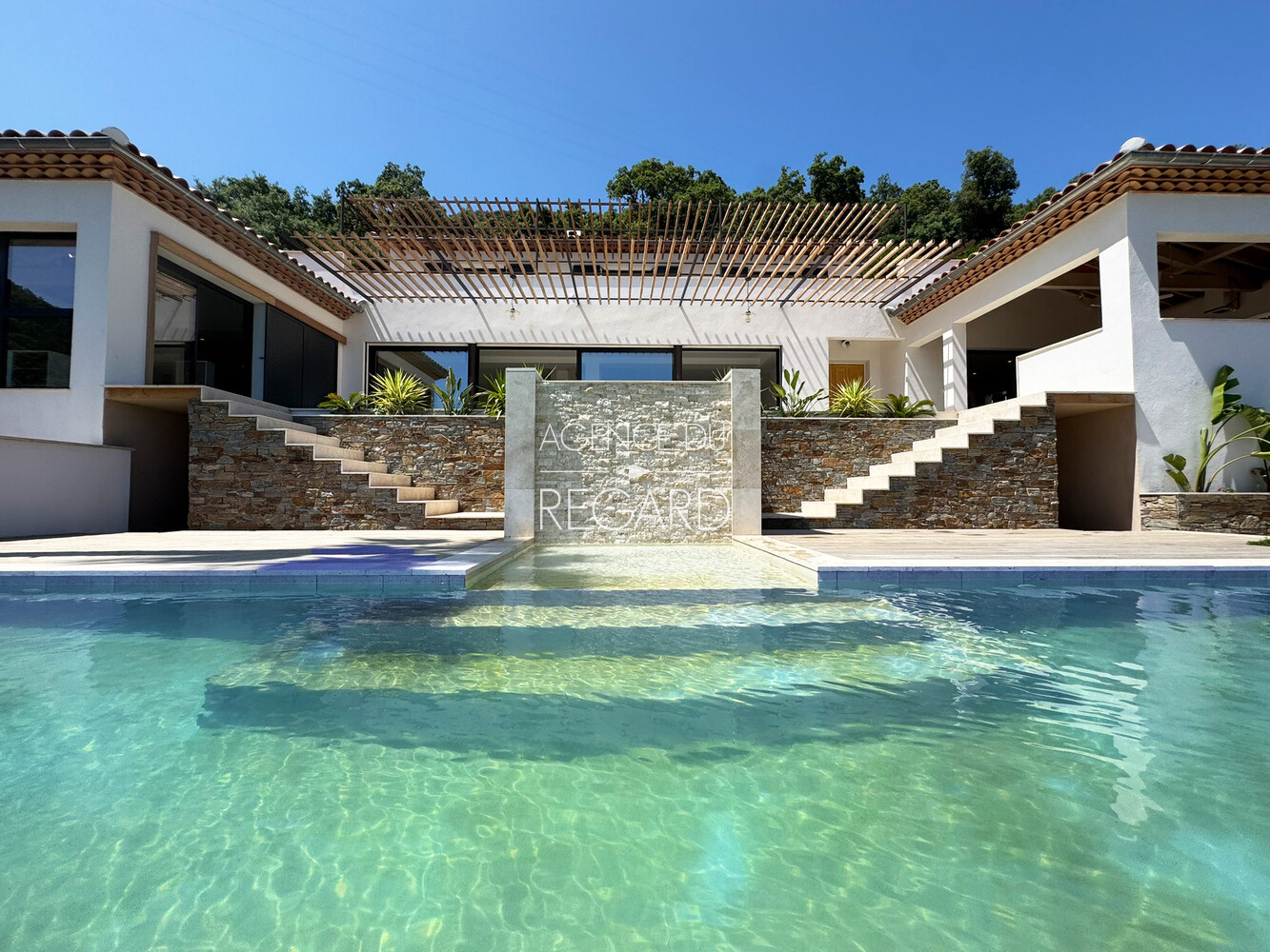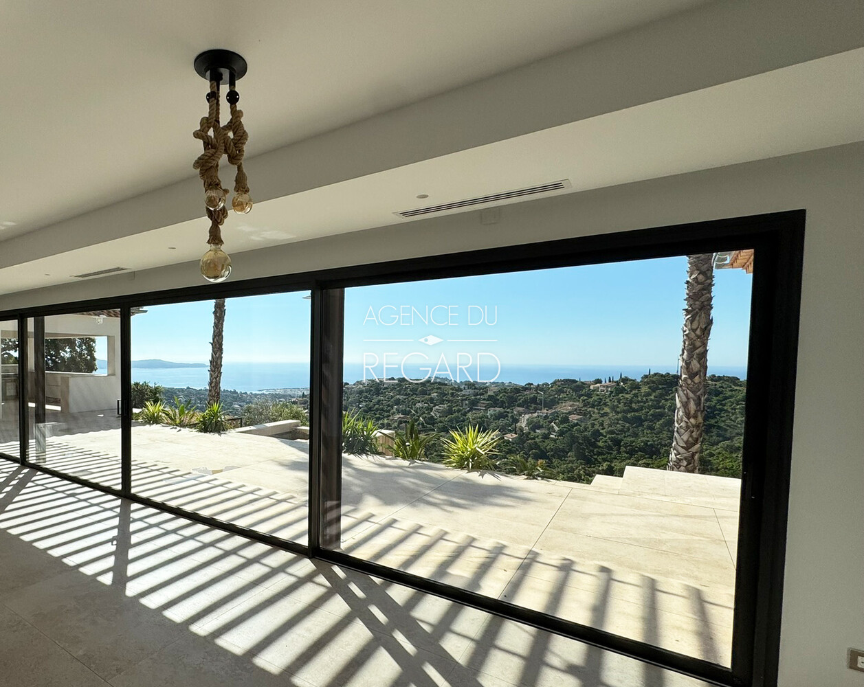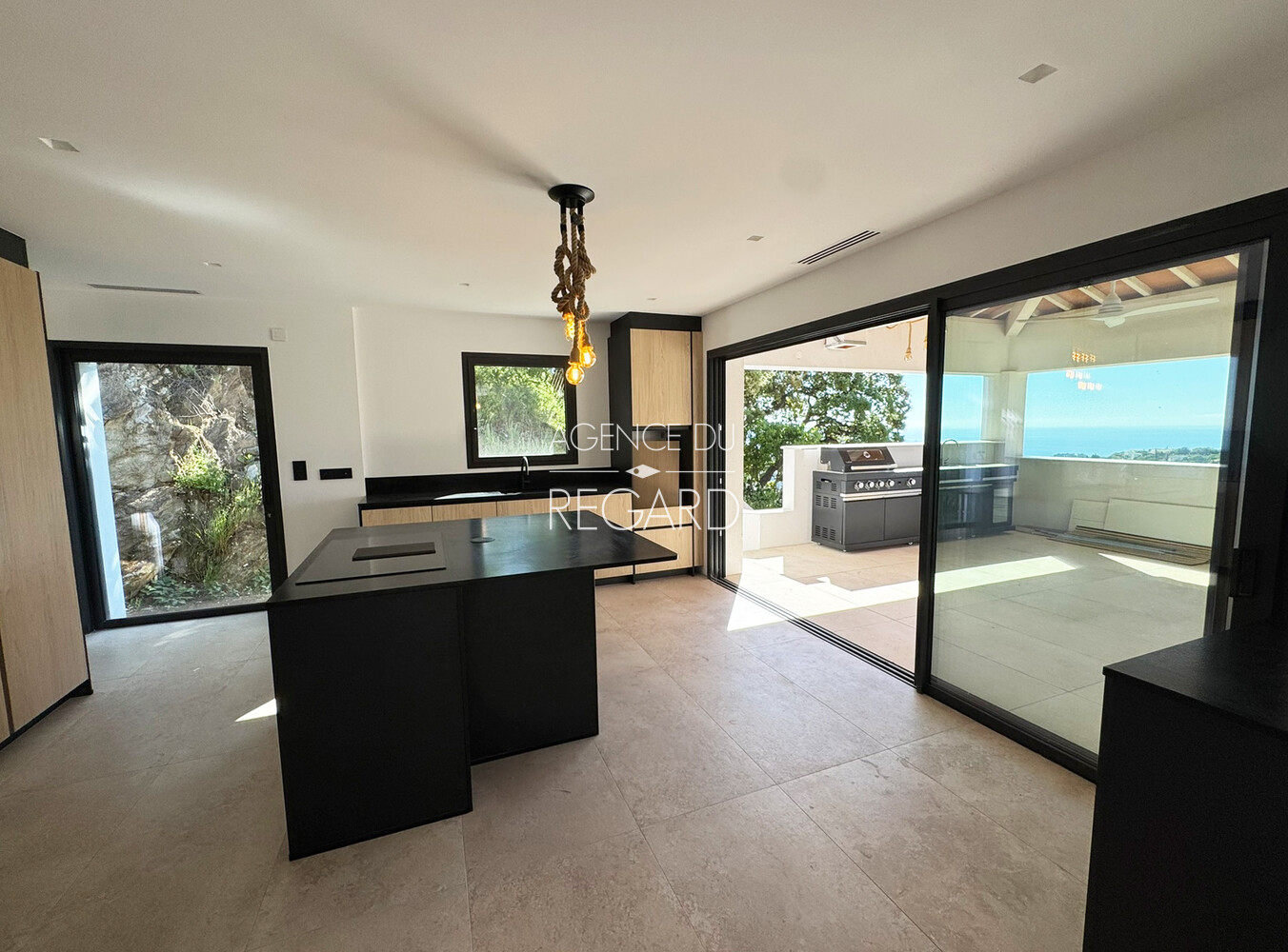 Just 8 minutes from a beautiful sandy beach with crystal-clear waters, this 3,576sqm south-facing property is located in a very quiet area on the hills of Cavalaire. It enjoys a beautiful sea view. The perfectly landscaped garden is planted with Mediterranean species. This traditional 270sqm villa, built on three levels, was completely renovated in 2025 with quality materials. The living areas extend onto terraces that enjoy this magnificent sea view. There are 5 en-suite bedrooms and a studio. Swimming pool with jacuzzi. Garage. Energy Performance Certificate: B – GES: A