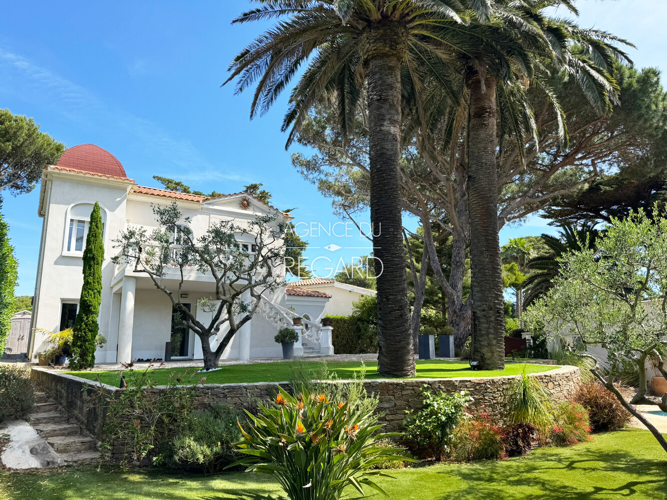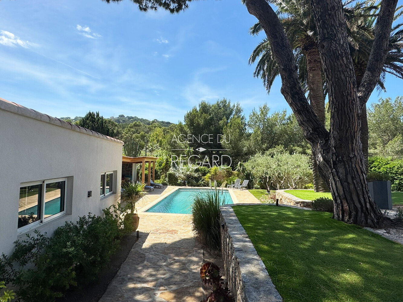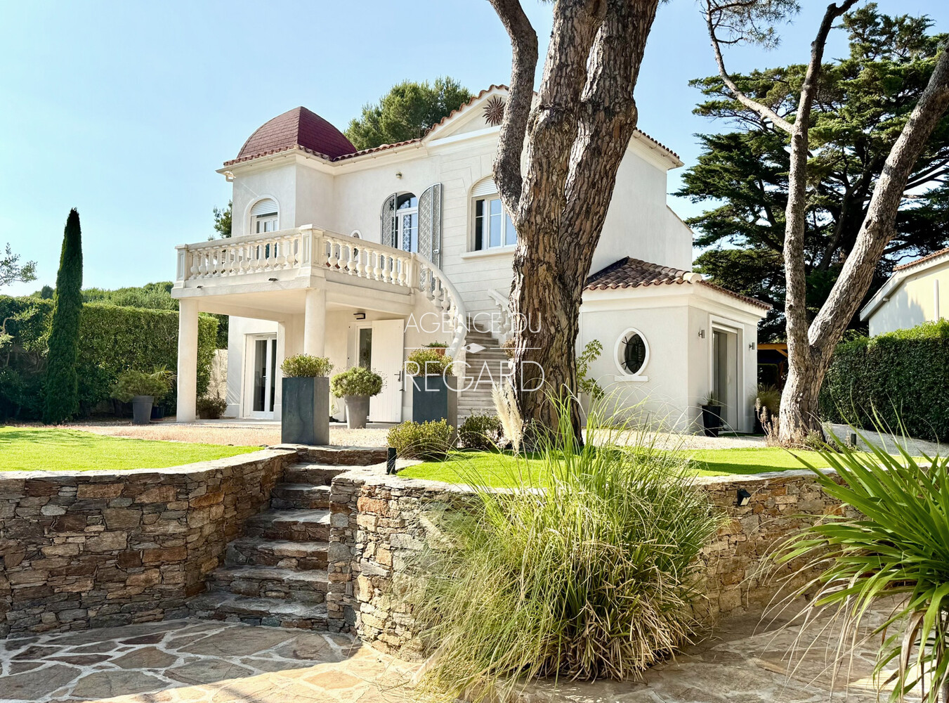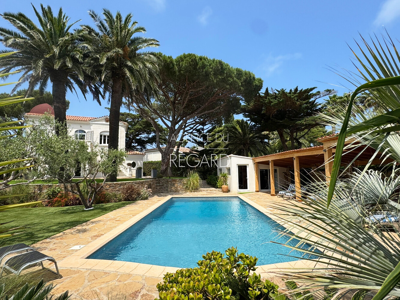 This 1,058sqm property is located in Giens at La Madrague, by the sea and on the edge of the forest. The beach is only 2 minutes by walk via private access. The garden is fully fenced, private, and perfectly landscaped. A pool house with its summer kitchen benefits from the peaceful surroundings. This atypique villa was completely renovated in 2016/17 with quality materials. It enjoys a sea view across Almanarre Bay to Carqueiranne. 3 en-suite bedrooms (possibility of 4). swimming pool 11.50x4.65m