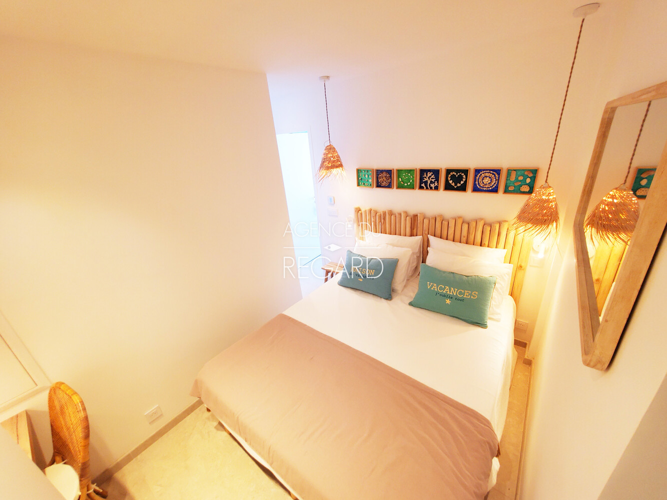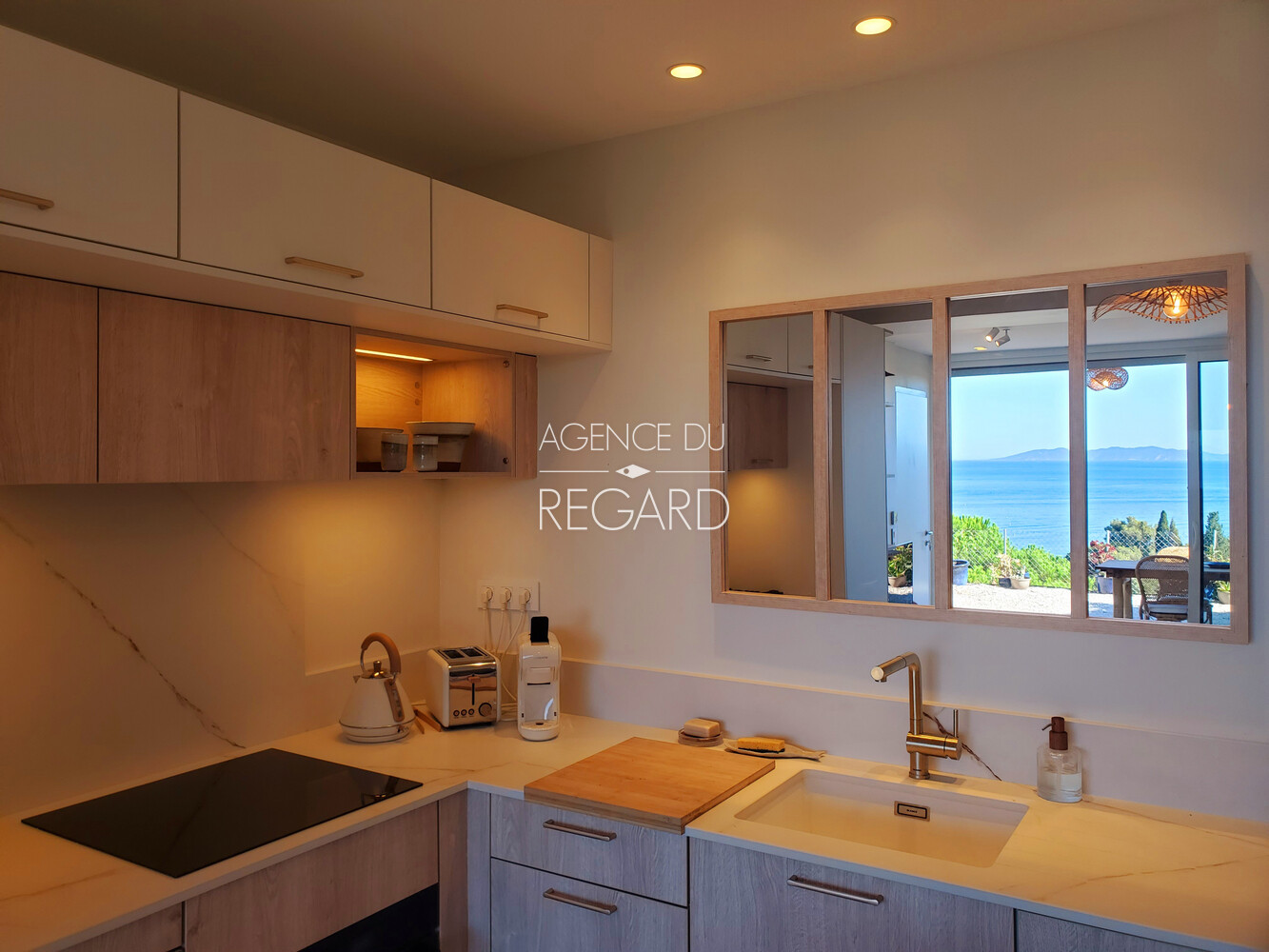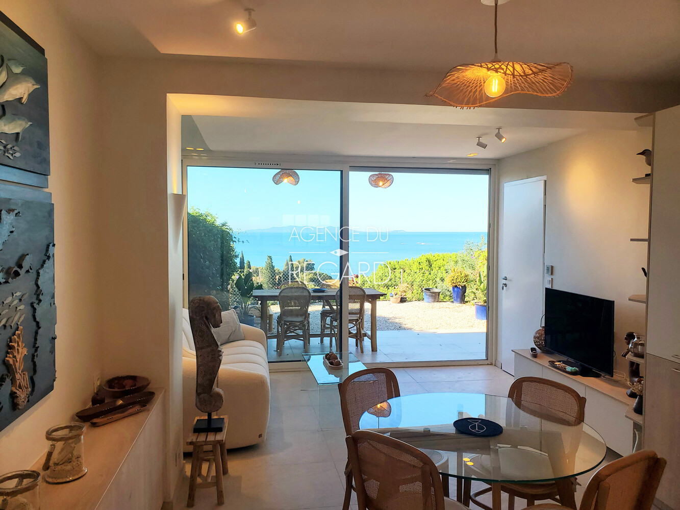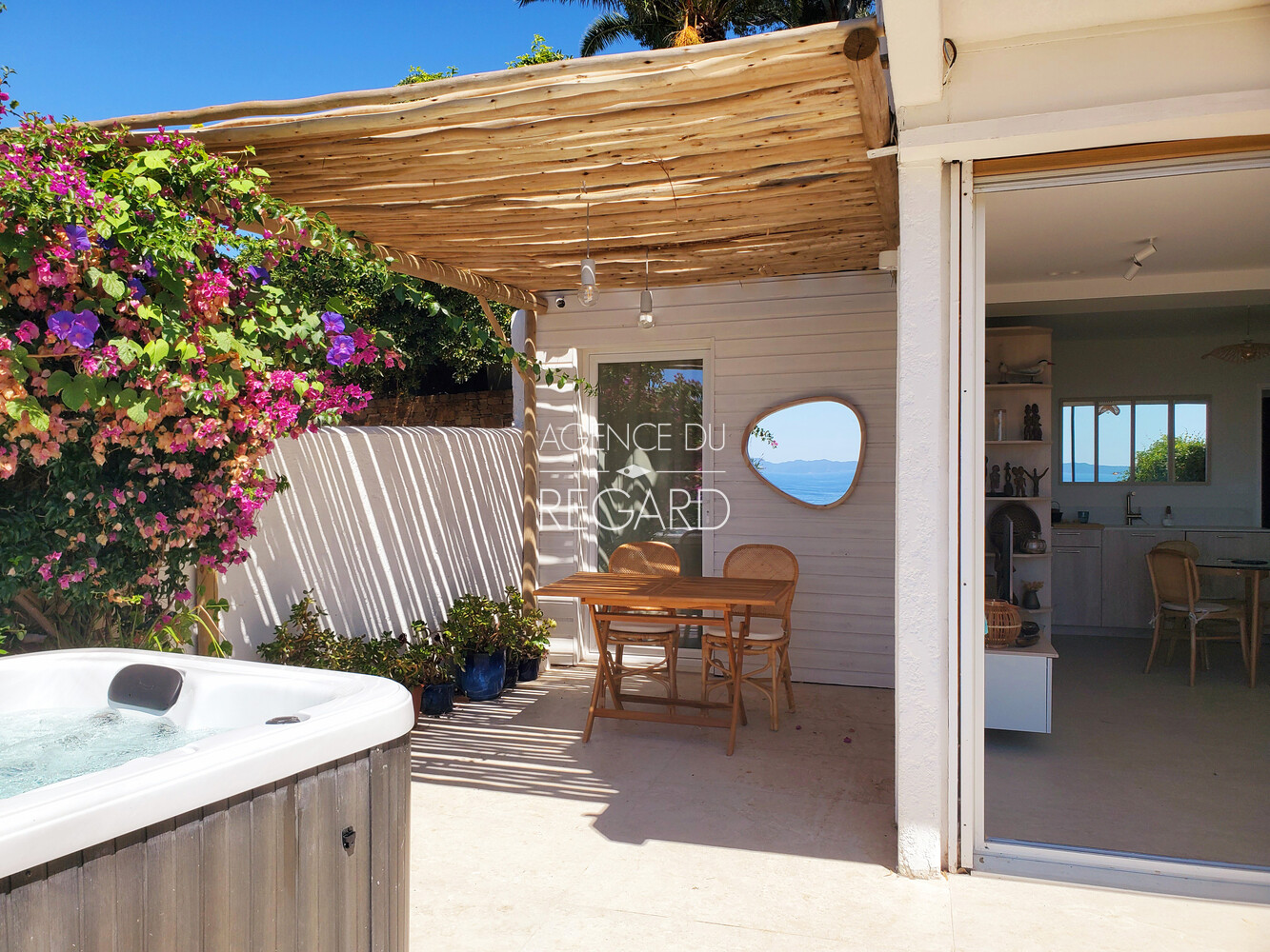 Le Lavandou, 8 minutes walk from the magnificent Cavalière beach, this 33sqm apartment is located on the ground floor of a small 10-unit condominium. It extends onto a 50sqm terrace with private use and panoramic sea views. No renovations are required. Jacuzzi with a beautiful sea view. Garden shed. Air conditioning. Private parking.