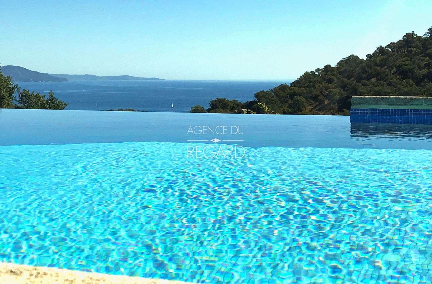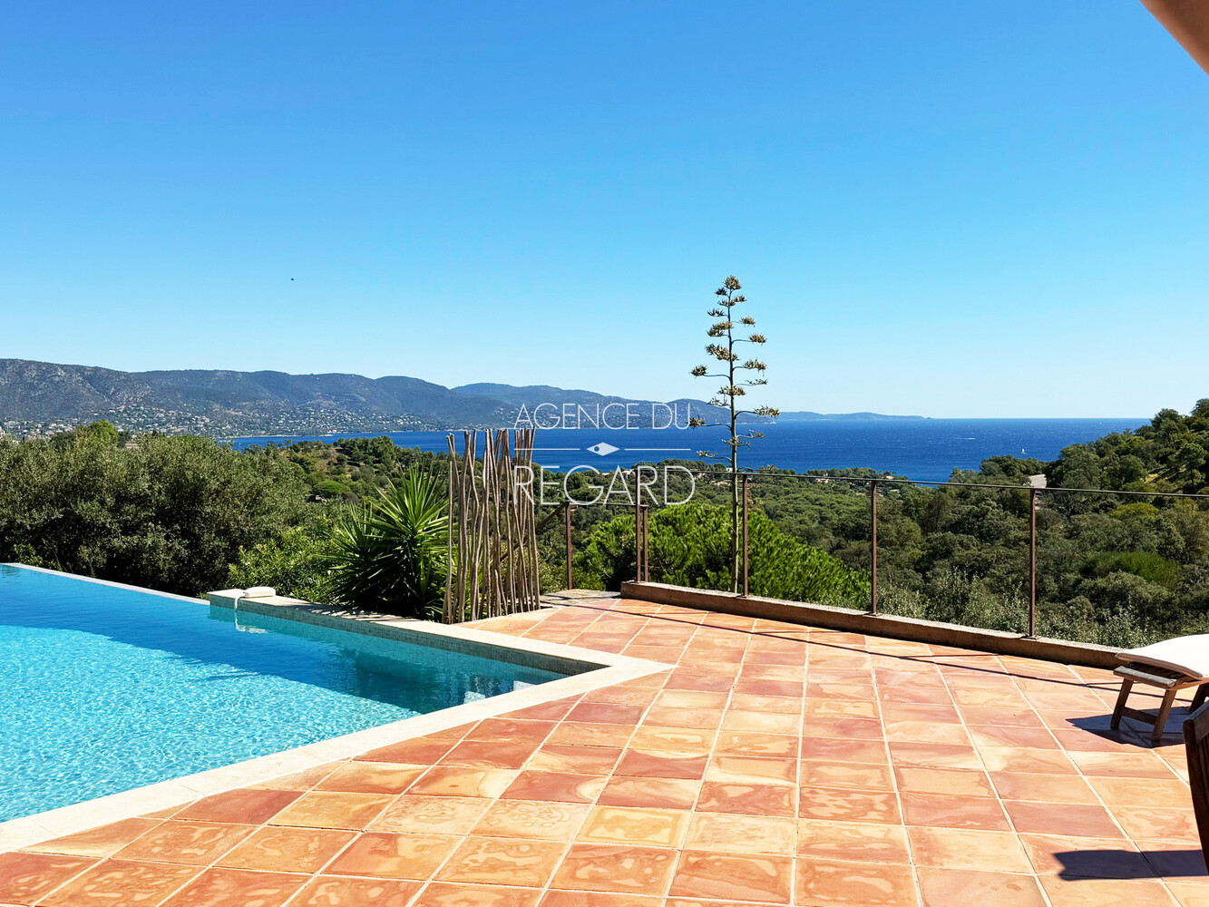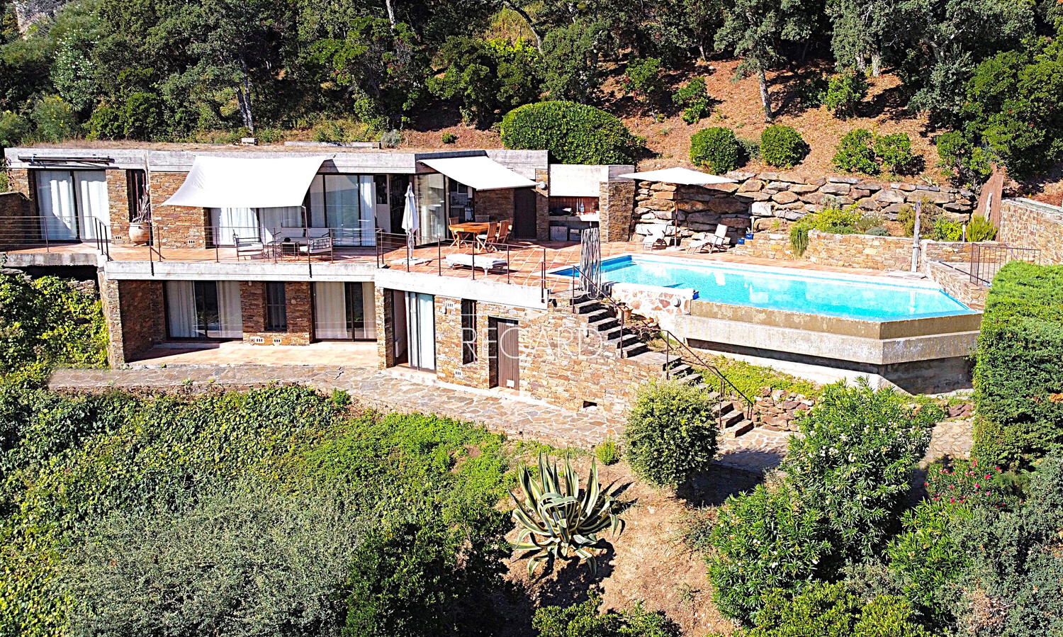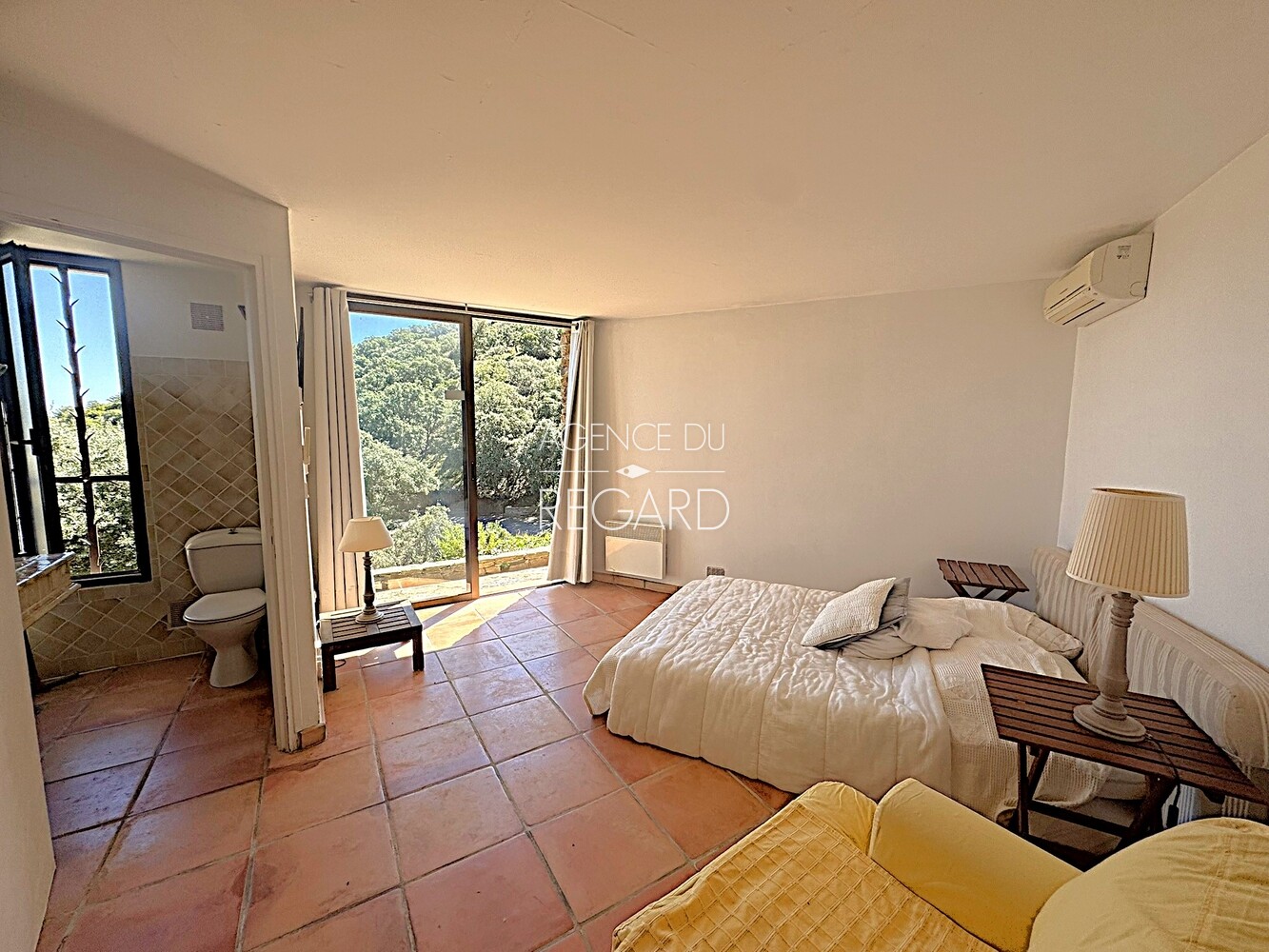 Exclusivity ! In Bormes-les-Mimosas, in the private and guarded Gaou Bénat estate, this 1,000sqm fully fenced property boasts beautiful views of the sea and the bay of Lavandou. Dry stone walls enhance the landscaped garden and the 10x5m pool area. A charming, wind-sheltered patio enjoys the transparent sea view and the peace and quiet of the setting. The villa 110sqm, built in 1990 on two levels, has been perfectly maintained to this day. The beach is a 20 minutes walk away. Two garages. Workshop.